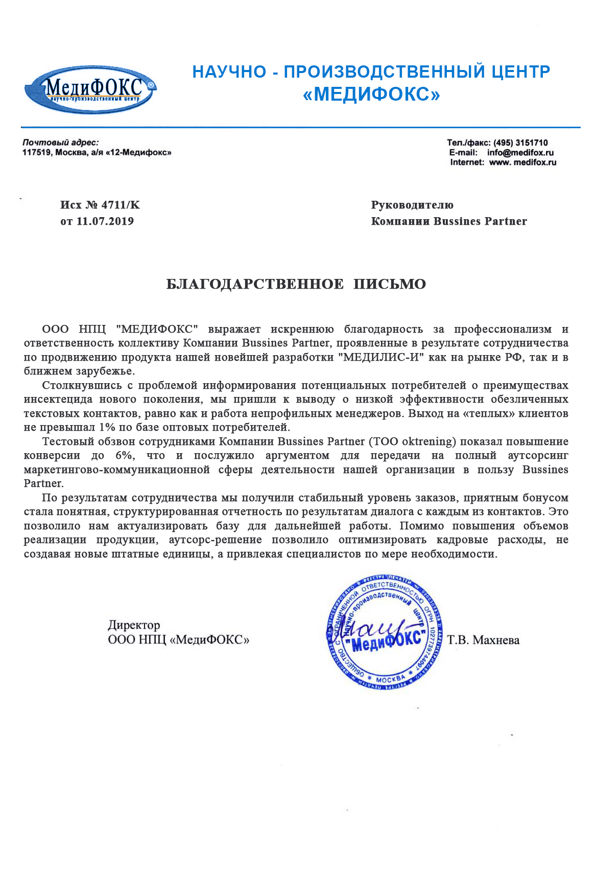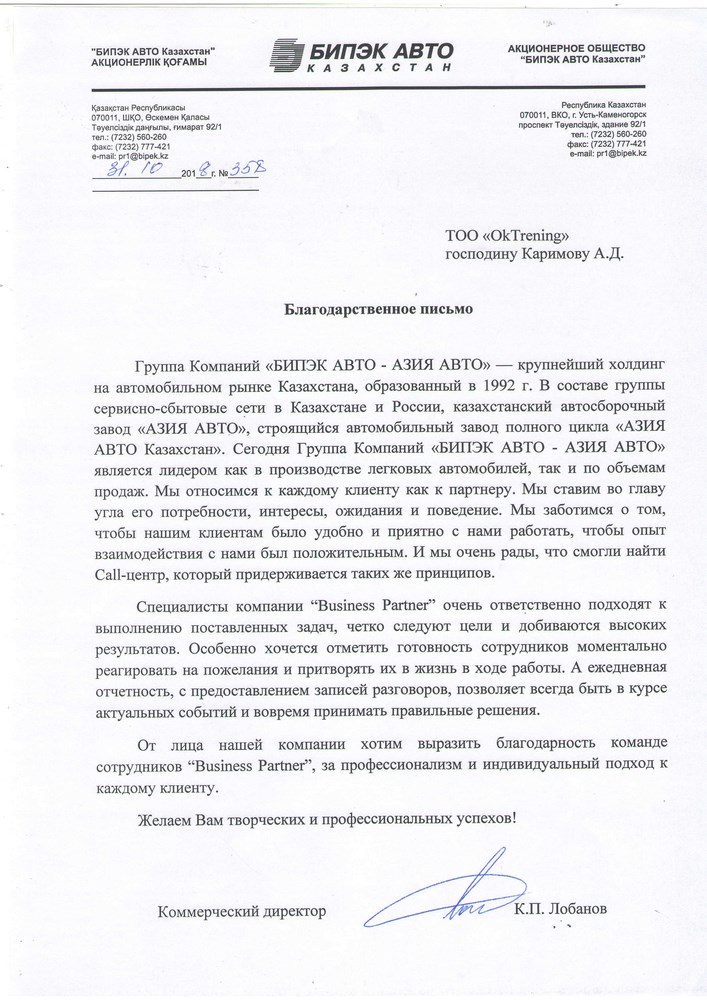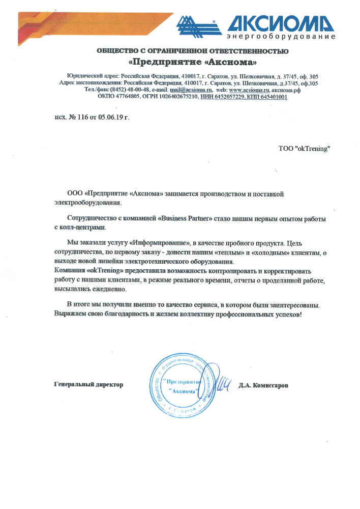 «…..За время успешной работы с компанией «Business Partner» были реализованы услуги по составлению сценария холодного звонка и «колл менеджера в аренду» для привлечении новых клиентов в городе Астана. Результатами продуктивной работы стали расширение клиентской базы. За 20 дней прозвона нам передали 44 встречи с теплыми клиентами…….»