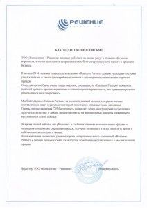ООО Rubin в лице руководителя отдела продаж выражает благодарность компании «Business Partner» за внедрение CRM-системы, которая повысила качество работы с клиентами, стандартизировала процедуры. Автоматизация операций значительно упростила работу отдела продаж.